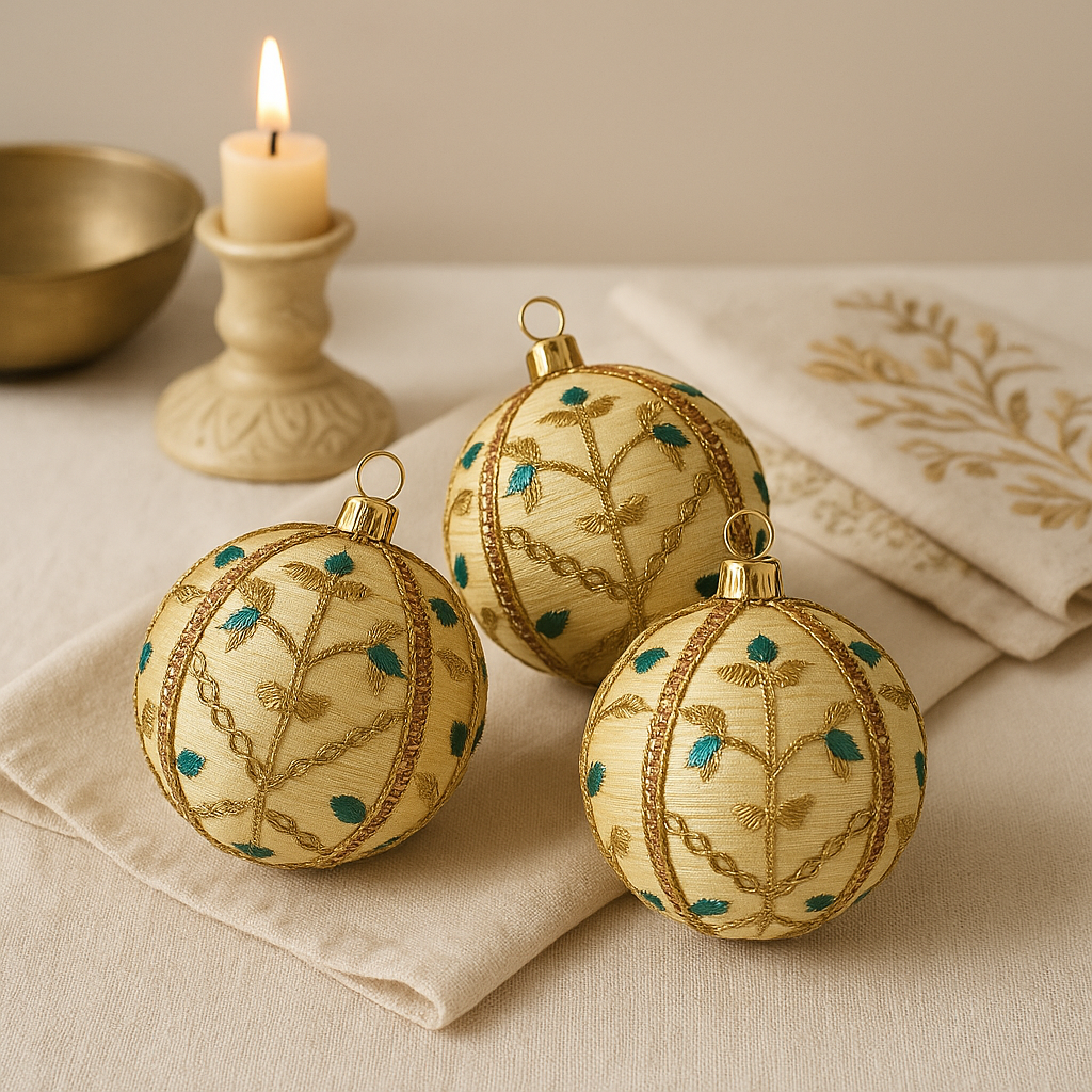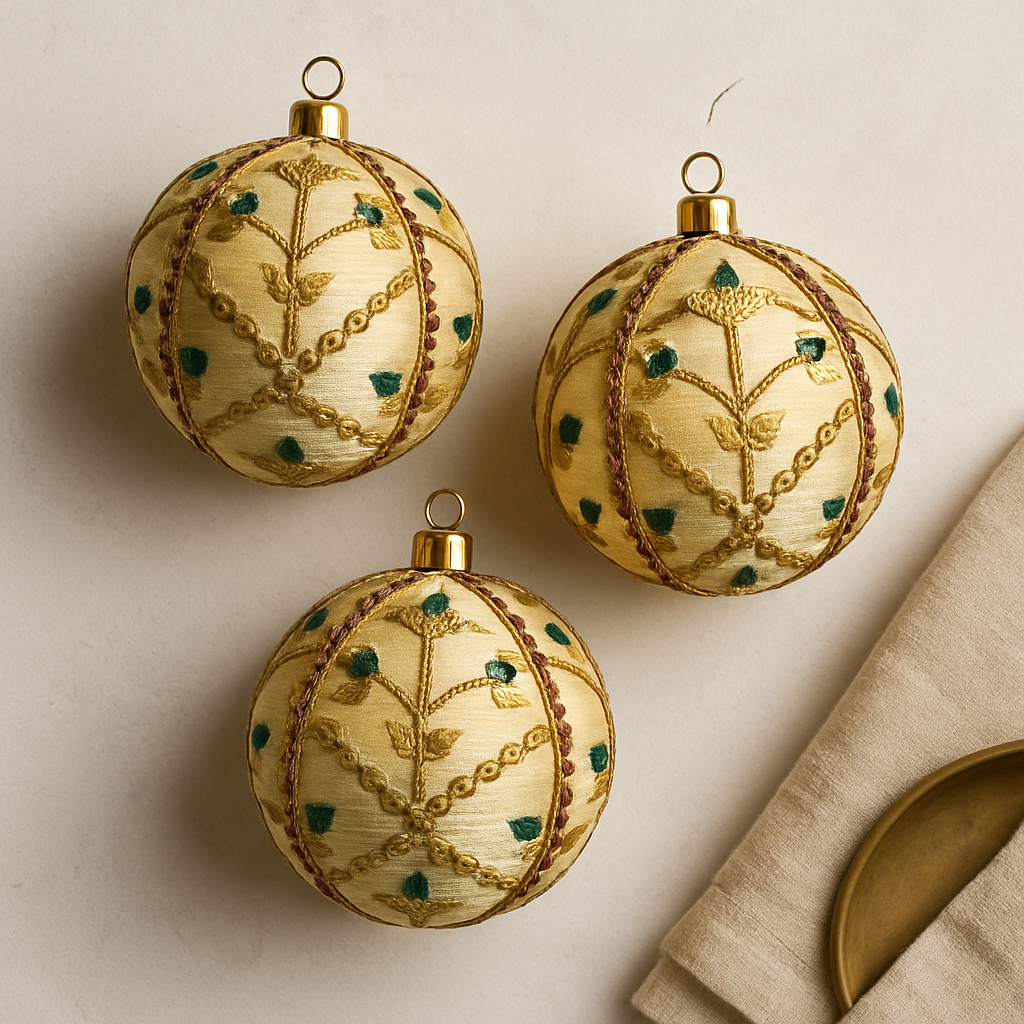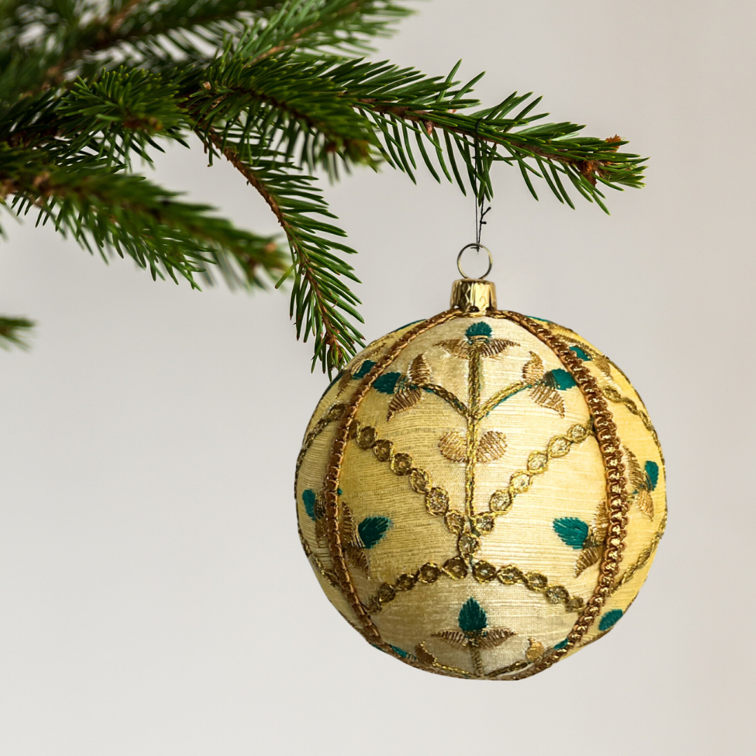 The Lalit Bauble is a quietly elegant decorative piece defined by soft colour, intricate embroidery, and refined contrast. Handmade in the UK using reclaimed ivory-gold brocade, each 10cm fabric bauble is individually crafted, ensuring every piece is entirely unique.
