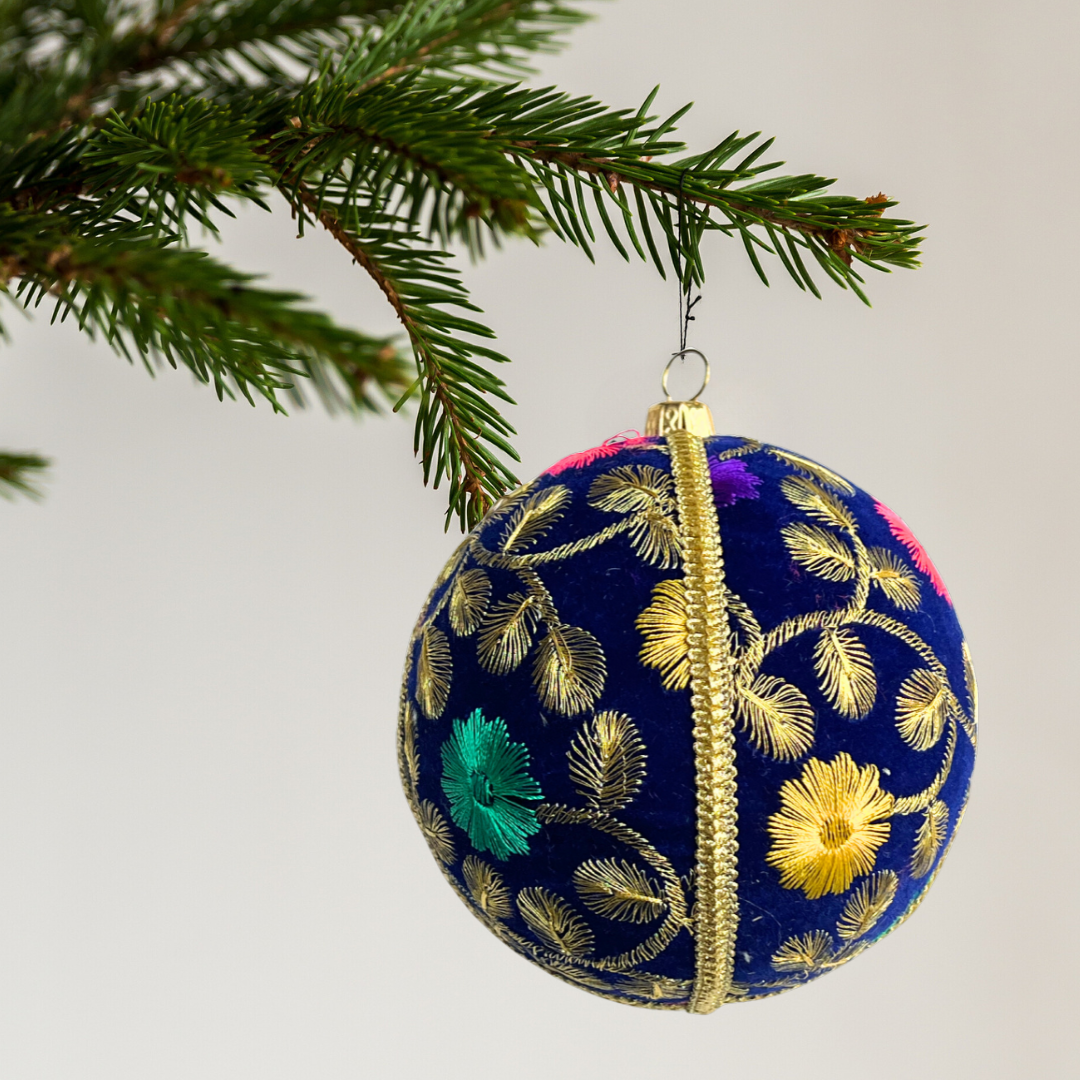 Each bauble is carefully constructed around a lightweight yet durable foam core, helping it maintain its shape while remaining easy to display. Due to the nature of reclaimed fabrics and hand-finishing, no two Mahir Baubles are ever exactly the same.