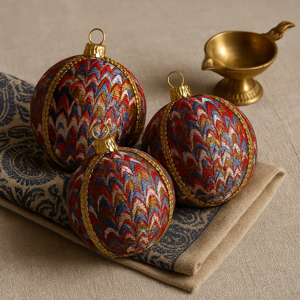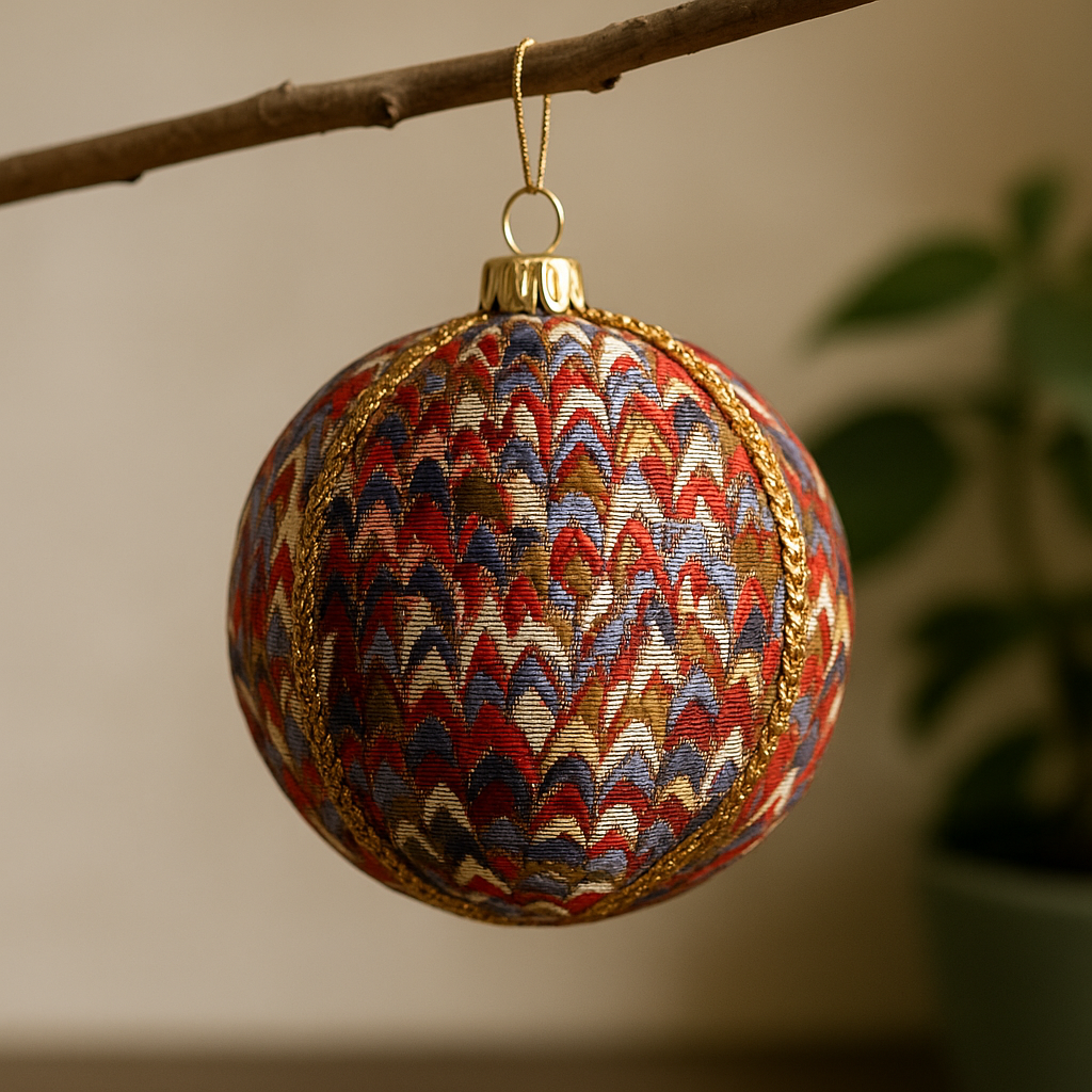 The Sahana Bauble is a refined decorative piece defined by rich colour, woven texture, and timeless detailing. Handmade in the UK using reclaimed brocade textiles, each 8cm fabric bauble is individually crafted, making every piece unique.