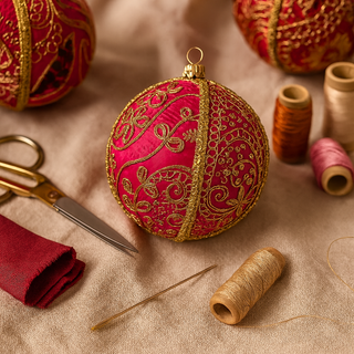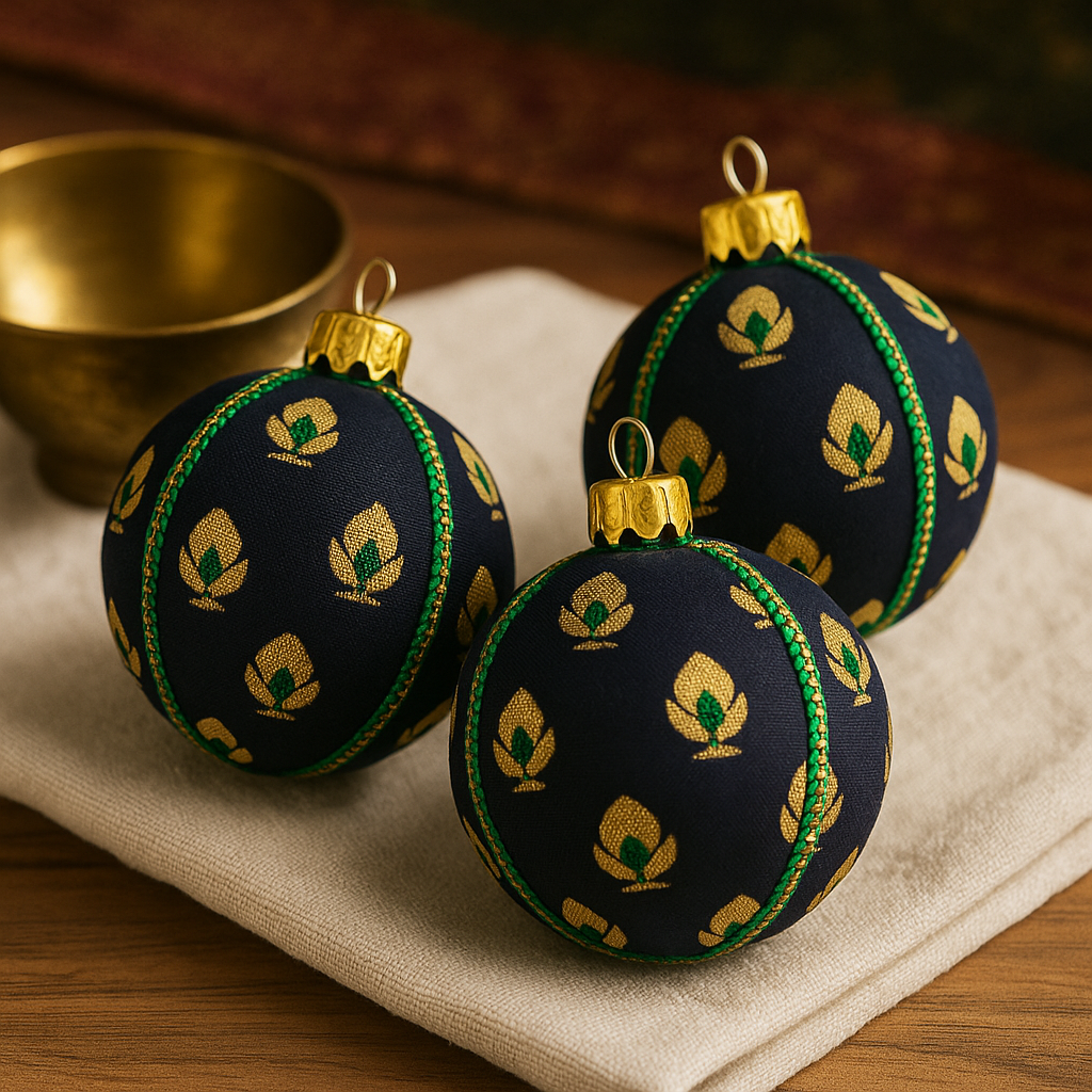 The Tamasvi Bauble is a refined decorative piece defined by contrast, restraint, and timeless elegance. Handmade in the UK using reclaimed brocade textiles, each 8cm fabric bauble is individually crafted, ensuring every piece is entirely unique.