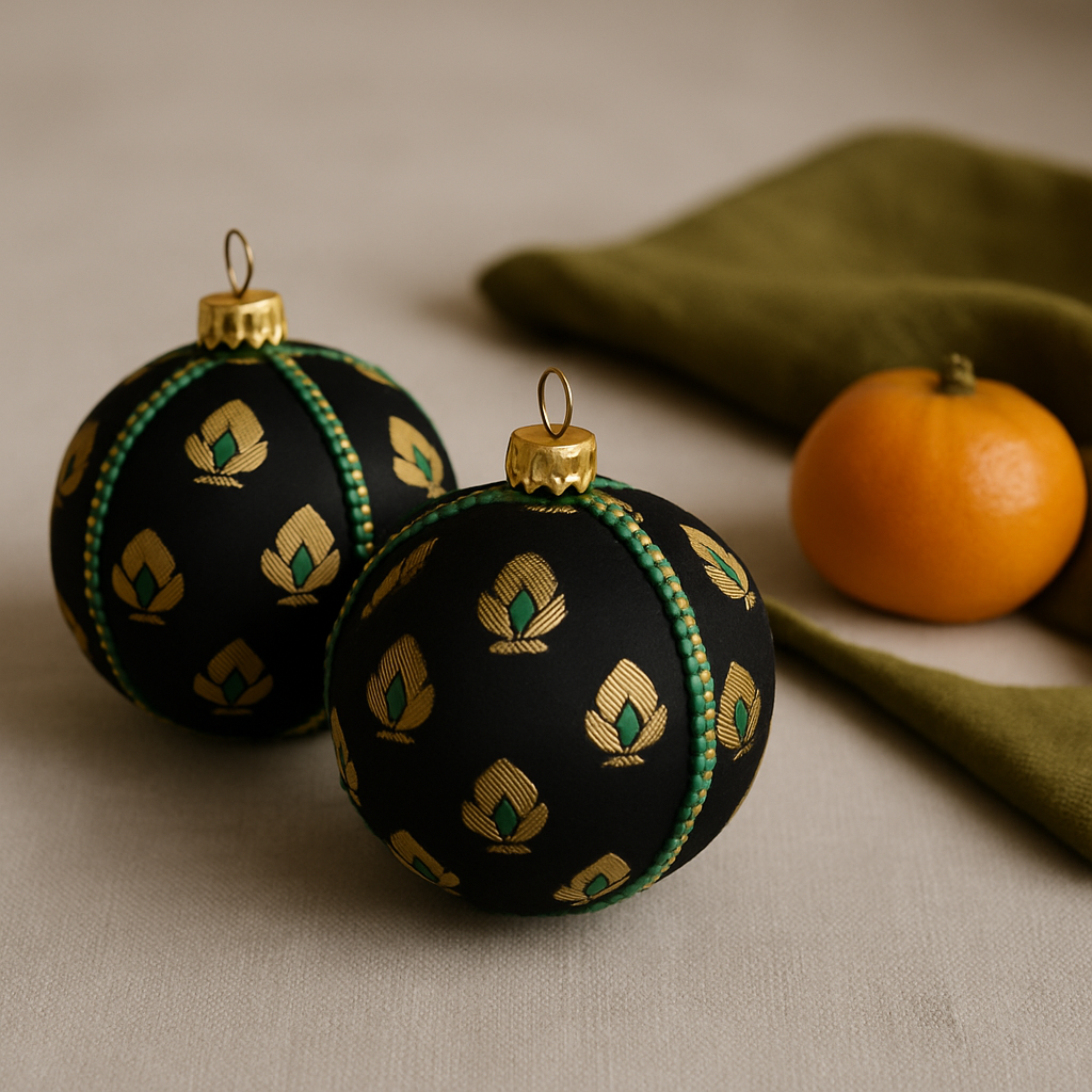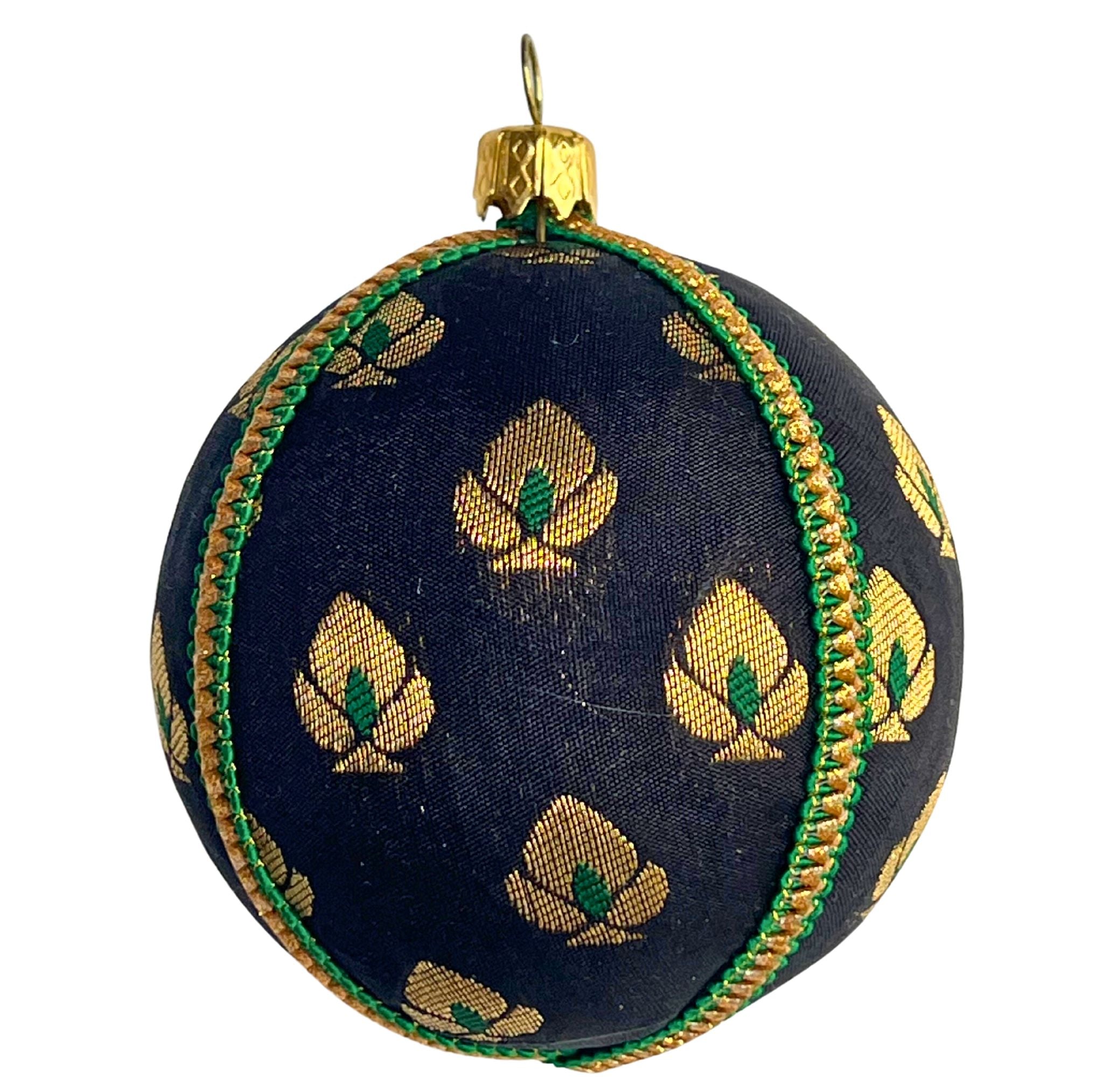 Tamasvi Bauble – 8cm Black and Gold Brocade Fabric Ornament with Emerald Trim