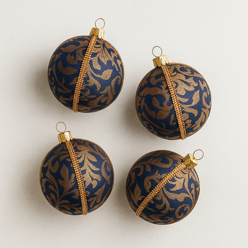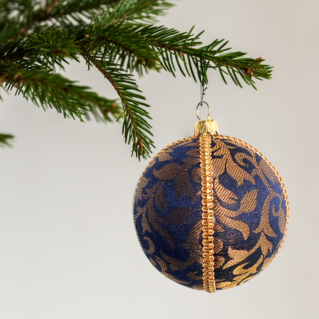 A deep blue base provides a rich backdrop for intricate gold baroque-style detailing, creating a sense of depth, elegance, and quiet opulence. The ornate patterning subtly catches the light, giving the surface a soft, luminous finish without feeling overly ornate. The result is an ornament that feels both traditional and contemporary.