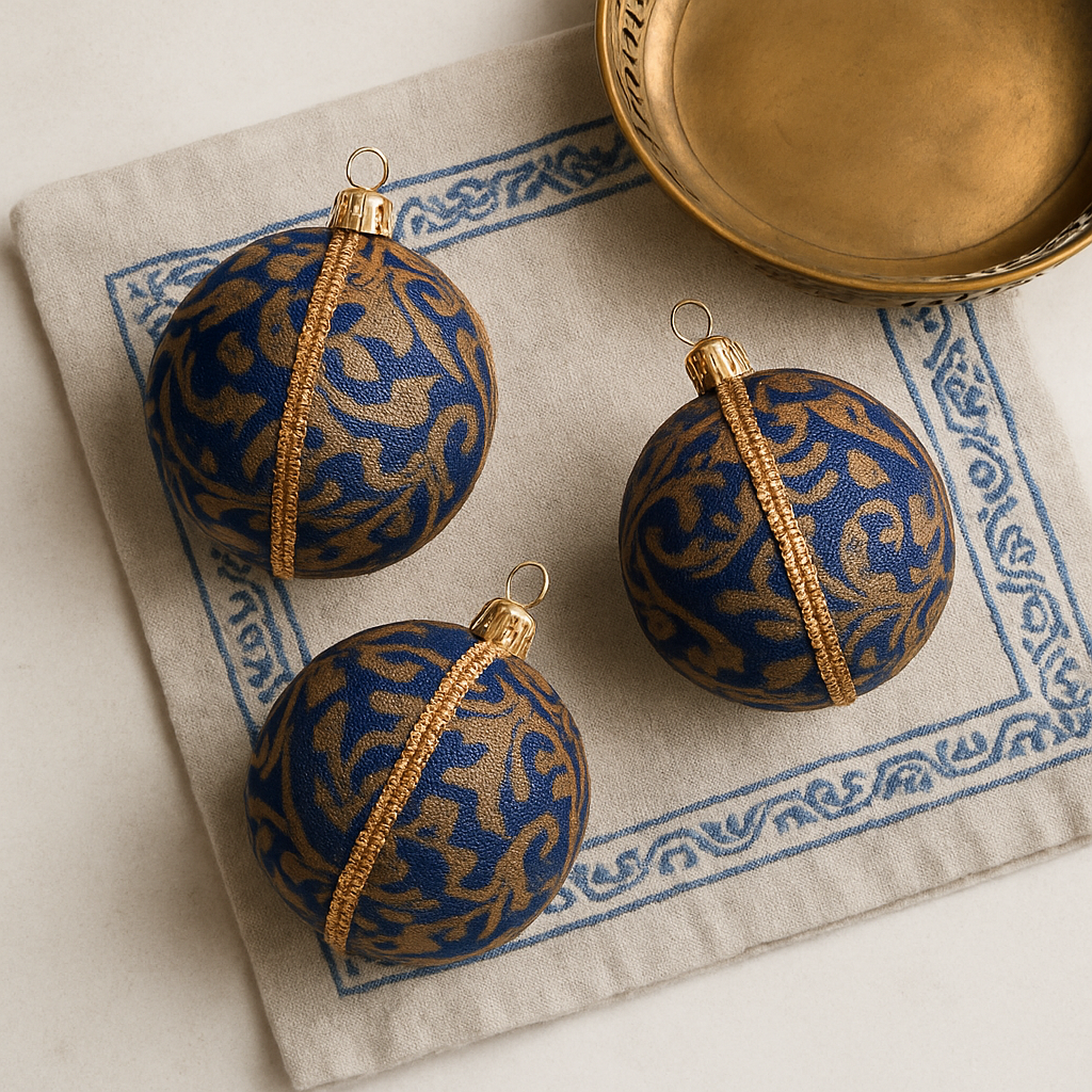 The Vani Bauble is a refined decorative piece inspired by classical baroque patterning and timeless design. Handmade in the UK using reclaimed textiles, each 8cm fabric bauble is individually crafted, ensuring every piece is truly one of a kind.