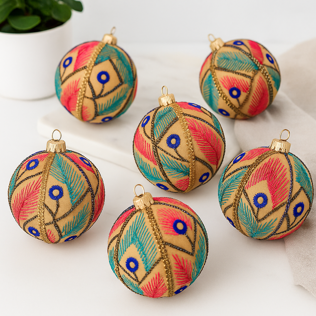 Each bauble is carefully constructed around a lightweight yet durable foam core, allowing it to retain its shape while remaining easy to display. Due to the nature of reclaimed fabrics and hand-finishing, no two Aarav Baubles are ever exactly the same. Each one takes over an hour to create, reflecting the care and craftsmanship behind every piece.