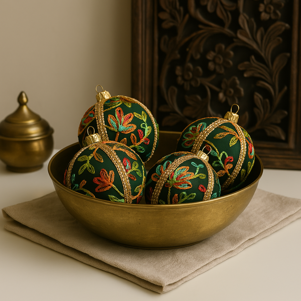 Set on a deep forest green base, multicoloured botanical embroidery flows across the surface in leafy motifs, creating warmth, texture, and movement. Finished with a polished metallic gold braid, the Anung Bauble balances rustic character with refined elegance, making it feel both artisanal and elevated.