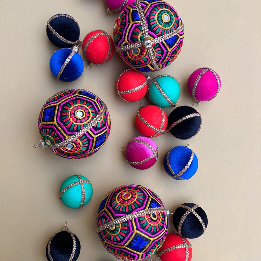 The Ananya Bauble is a bold decorative piece defined by contrast, colour, and intricate surface detail. Handmade in the UK using reclaimed textiles, each 10cm fabric bauble is individually crafted, ensuring every piece is entirely unique.