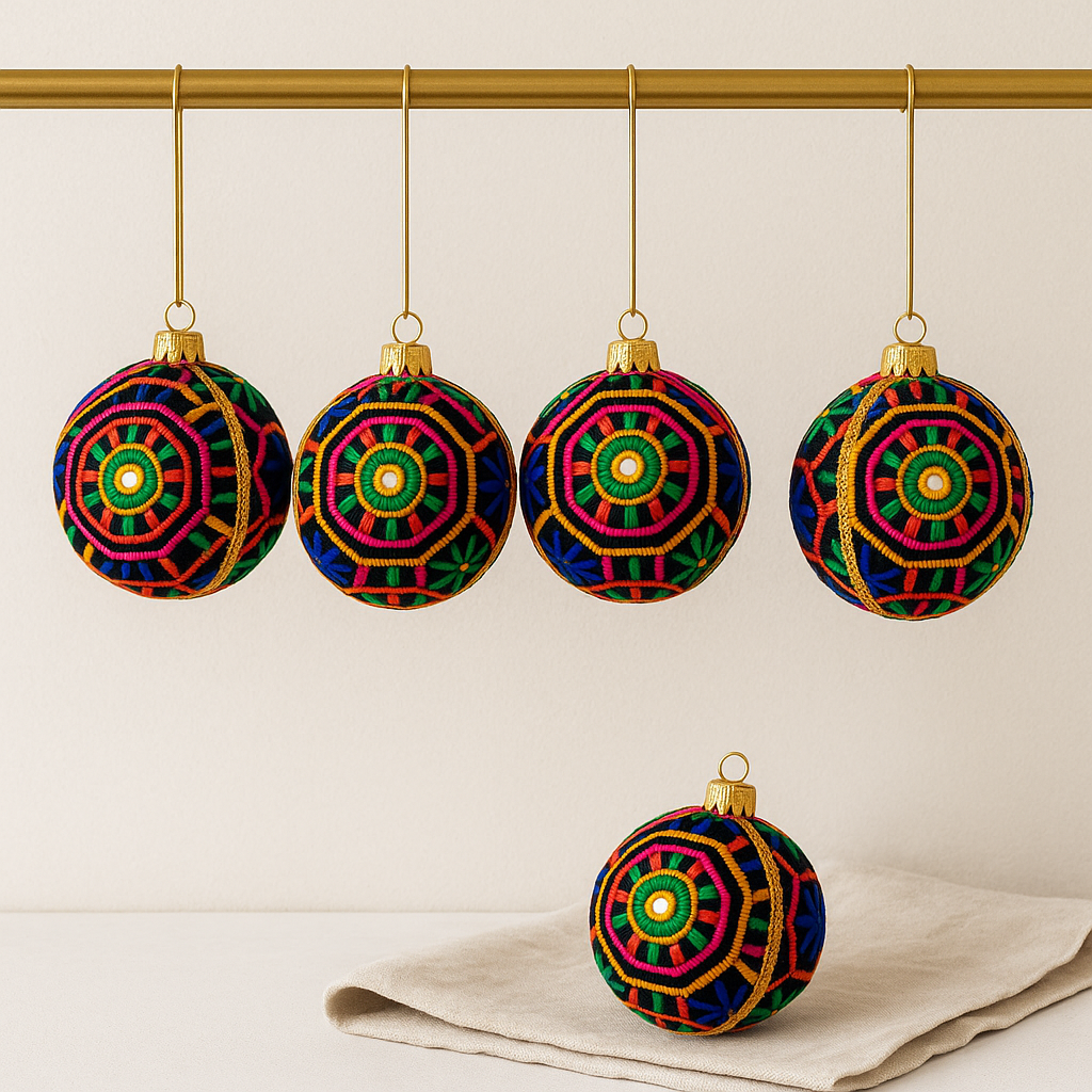 Ananya Bauble – 10cm Black Geometric Embroidered Fabric Ornament with Mirrorwork