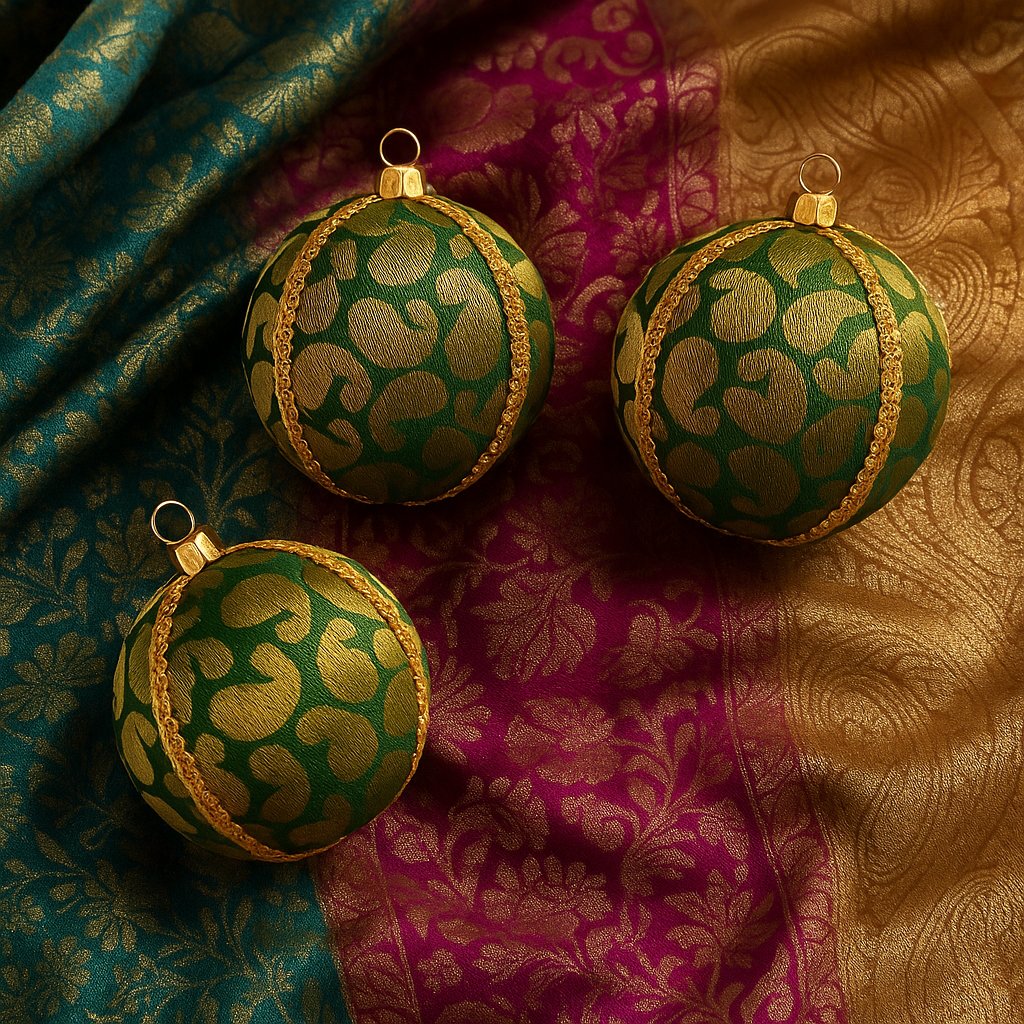 • Charu Bauble – 8cm Emerald Green and Gold Paisley Brocade Fabric Ornament