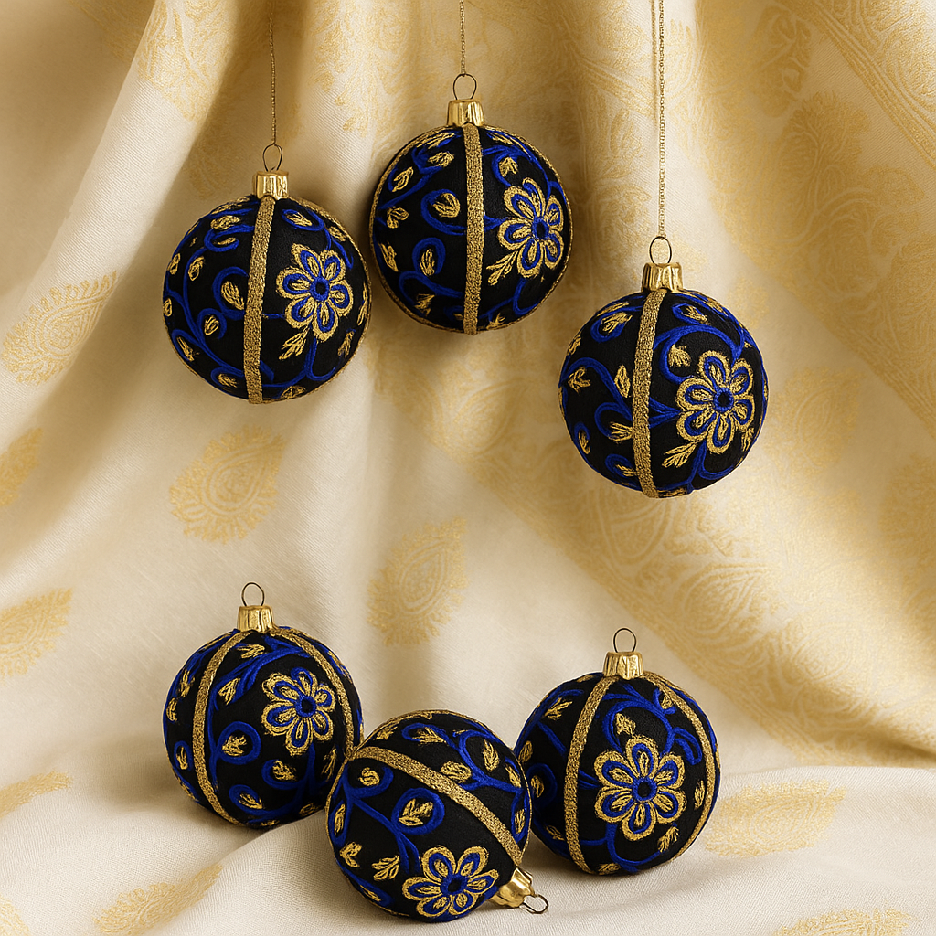 • Ishana Bauble – 8cm Black Fabric Ornament with Royal Blue and Gold Floral Embroidery